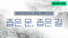 2026년 온누리교회 작은예수 40일 새벽기도회 <좁은 문, 좁은 길> (2/23~4/3) ※ 2026년 작은예수 40일 새벽기도회 퀵VOD는 예배가 끝나는 즉시 퐁당에서 가장 빠르게 만나실 수 있습니다. 자동 제공되는 영상 특성상 시작 타이틀과 종료 후 일부 구간이 함께 포함될 수 있습니다.